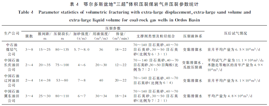 基于页岩气体积压裂的成功经验,结合煤岩储层割理发育的特征,创新形成了以“超大排量、超大砂量、超大液量”为核心的“三超”体积压裂技术(表4)。该技术通过构建复杂缝网,实现储层有效改造与人造气藏构建,目前已累计应用到200余口水平井中。其技术优势主要体现在两方面:一是采用超大注入规模,以大排量、大液量施工为复杂缝网的形成提供充足能量;二是通过超大加砂规模,确保支撑剂充分铺置,保障压裂后裂缝的长期导流能力。
