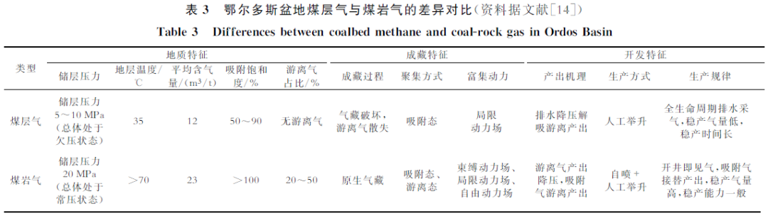 传统的煤层气开发仅将煤岩视为产层进行评价,未将其作为烃源岩或围绕以其为核心的全油气系统开展研究,缺乏针对系统整体的勘探部署。此外,从油气地质学角度出发,传统的煤层气与煤岩气二者在地质特征、成藏特征和开发特征三方面也存在明显差异[14](表3)。早期煤层气的认识制约了人们对煤系内油气资源勘探潜力的预估,致使大量油气资源,如深层煤岩气等,长期未能落实。