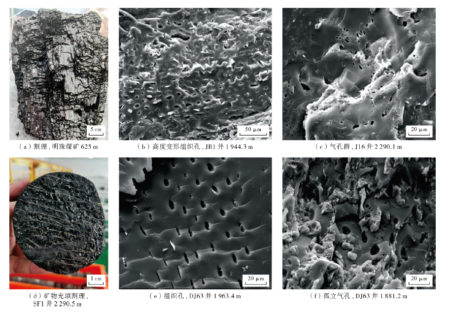 首先,煤源岩中发育不同成因的孔隙和裂隙,包括割理、层理、构造裂隙、气孔和胞腔孔等。各类储集空间的存在为滞留煤岩气的储集提供了必要的条件(图6)。然后,在聚煤沉积体系中,煤岩层通常上覆泥页岩或灰岩盖层。以鄂尔多斯盆地的8号煤岩为例,其上覆盖层多为泥页岩或灰岩,单层厚度介于3~8 m,能够有效阻止油气逸散,为煤岩气的聚集与保存提供可靠的条件[49-50]。最后,煤系中发育的大尺度断裂构造作为天然气的运移优势通道,在煤源岩与砂岩或碳酸盐岩储层存在时空匹配关系时,通过相互连接,引导煤岩气向常规储层运移,可形成大规模常规气藏。