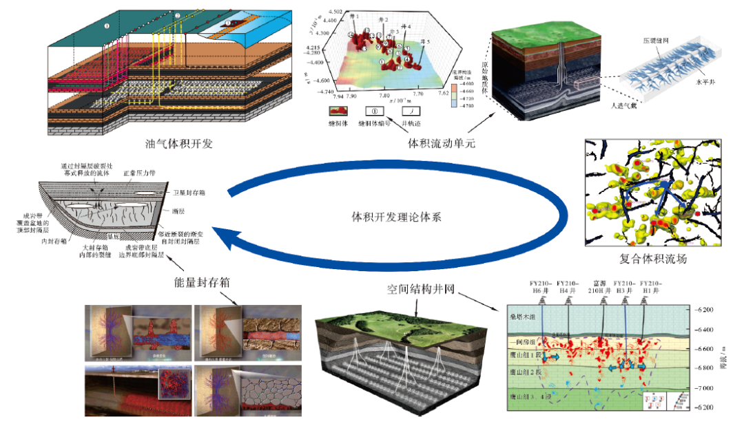 以体积开发理论为核心,系统提出了体积开发、体积流动单元、复合体积流场、空间结构井网、能量封存箱5大核心概念(图11),衍生出天然缝洞单元体、人工缝网单元体、断溶体油藏等系列关联概念,从而构建起层次清晰的理论体系,为体积开发理论的发展奠定了基础。