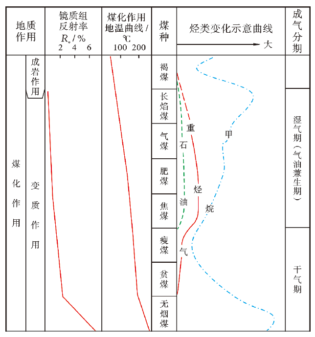 (3)全演化过程生气:煤源岩的生烃演化具有生物演化与热演化双重特征,其成熟度从低阶到高阶连续分布,对应不同煤种(如褐煤、烟煤、无烟煤)。煤岩的热演化生气可划分为4个阶段[29]。Ro<0.5%为生物-热演化共同作用阶段,该阶段以有机质发酵和CO2还原生成生物气为主,同时生成少量热成因气;0.5%<Ro<1.3%为成熟阶段,主要受热演化作用控制,煤岩中键合力较小的侧链脱落开始形成天然气,同时生成少量液态烃;1.3%<Ro<2.5%为主生气阶段,干酪根热解和长链液态烃裂解共同生气;Ro>2.5%为过成熟生成干气阶段,煤岩中的芳香环、烷基酚类的甲基大量断裂[30-31],同时C2+烃类裂解,以生成甲烷为主。总之,煤从有机质沉积后至石墨化前均在生气。
