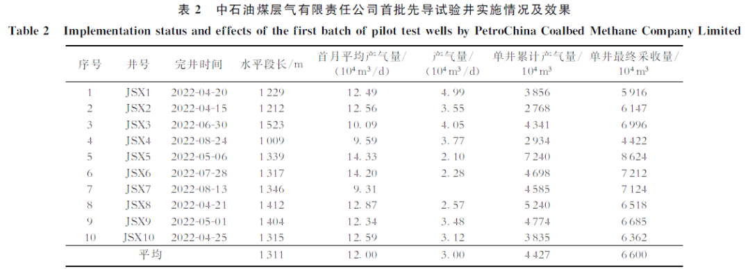 2020年4月,第一作者赴中石油煤层气有限责任公司调研。针对其发展瓶颈,基于“煤层作为优质烃源岩,深层煤储层保存条件好、游离气含量高”的认识,提出了“由浅部煤层气向深层煤岩气战略转变”的发展思路。该建议获得了中石油煤层气有限责任公司的采纳,随即在鄂尔多斯盆地大吉区块部署实施10口深层煤岩气先导试验水平井。试验井于2022年8月全部完井,2023年3月投产。试采阶段,平均单井产量达12×104m3/d;截至2025年,平均单井累积产气量达4 400×104m3,最高单井累积产气量达7 240×104m3,预计单井最终采收量(EUR)可达6 600×104m3。这表明针对鄂尔多斯盆地东缘深层8号煤岩储层的勘探取得了重大突破(表2)。