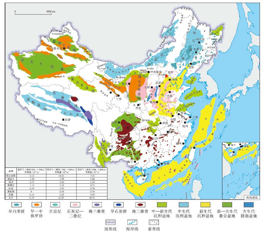 中国煤炭资源丰富,主要发育5套煤系地层(分别为石炭系、二叠系、三叠系、侏罗系和白垩系煤系地层),以及5大聚煤区(分别为华北、西北、西南、华南和东北聚煤区)。受区域地质演化、成煤环境和后期改造作用影响,不同聚煤区不同时期煤系地层的岩性组合与煤阶特征差异明显。华北地区的鄂尔多斯盆地主要发育石炭系—二叠系中—高阶煤和三叠系低阶煤;西北地区涵盖塔里木、准噶尔、柴达木和吐哈等盆地,煤系地层中主要为侏罗系中—低阶煤;华南地区主要发育二叠系中—高阶煤;西南地区的四川盆地主要发育二叠系中—高阶煤;东北地区的松辽盆地、二连盆地群主要发育白垩系中—低阶煤(图7)。