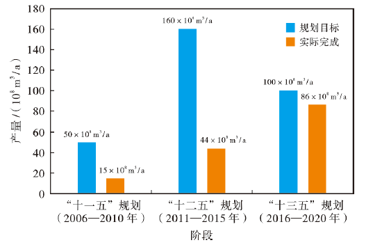 图1从“十一五”规划(2006—2010年)到“十三五”规划(2016—2020年)中国煤层气的规划产量与实际完成产量情况
