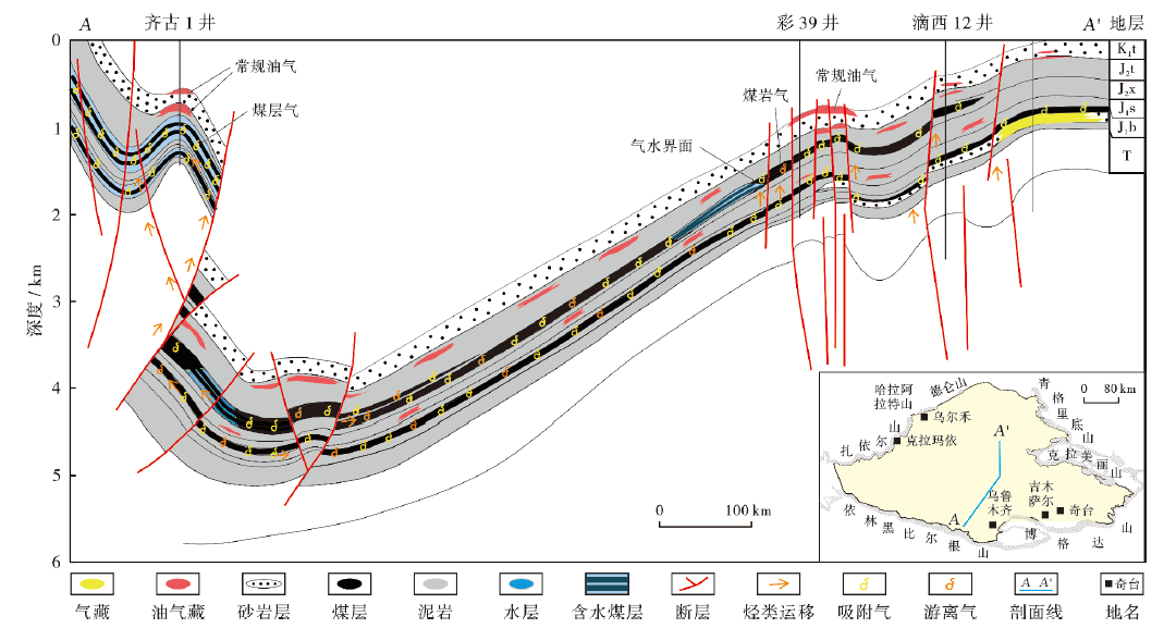 注:T—三叠系;J1b—下侏罗统八道湾组;J1s—下侏罗统三工河组;J2x—中侏罗统西山窑组;J2t—中侏罗统头屯河组;K1t—下白垩统吐谷鲁群。