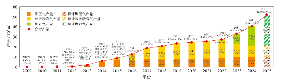 大吉区块深层煤岩气的突破带动了全国煤岩气勘探开发的热潮。中国石油天然气集团有限公司(中国石油)、中国石油化工集团有限公司(中国石化)、中国海洋石油集团有限公司(中国海油)和陕西延长石油(集团)有限责任公司(延长石油)等企业均加大了在煤岩气领域的勘探投入与技术布局。目前,鄂尔多斯盆地深层煤岩气已探明储量超过6 000×108m3,初步预测2025年的产量规模能够突破40×108m3。此外,四川盆地、准噶尔盆地亦取得勘探突破,塔里木盆地、吐哈盆地、渤海湾盆地以及东北地区多个盆地群也已启动系统评价,这标志着中国煤岩气产业正加速进入快速发展新阶段。