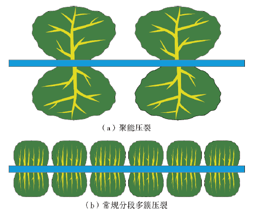 为响应节水减排与降本增效的双重需求,提出“能量聚焦、高效造缝”的新型改造理念,即将有限压裂能量聚集于单簇射孔段,采用单簇、少孔、高排量模式,提高缝内的净压力与造缝效率,从而提升储量动用程度[53](图10)。基于该理念,2024年,中国石油勘探开发研究院成功研发了煤岩气聚能压裂技术,并率先开展了2口井的先导试验,后续由中国石油长庆油田公司牵头完成10口井的扩大试验,实现了规模化验证。