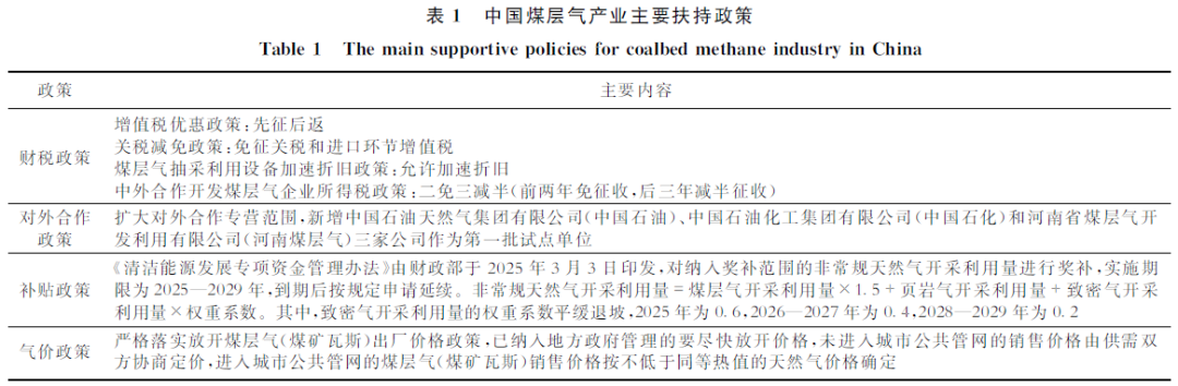中国在政府系列政策(表1)的引导与支持下,煤层气产业逐步发展并形成一定的规模。1996年,经国务院批准,由原煤炭工业部、地质矿产部和中国石油天然气总公司共同组建了中联煤层气有限责任公司,这标志中国煤层气开发步入专业化、规范化轨道。1996—2005年为中国煤层气战略突破与区域拓展期,该阶段中国的煤层气勘探主要集中于沁水盆地,实现了资源评价与勘探的战略突破,同期在鄂尔多斯、四川和二连等盆地也开展了系统评价,取得了一系列工业发现。1998年,沁水盆地在JS1井煤层气田获得产气量达4 050 m3/d的工业气流;2005年,该气田提交煤层气探明储量352×108m3;2006年,中国首个煤层气田开发方案(《沁水盆地煤层气15亿立方米/年产能建设开发方案》)编制完成,沁水盆地煤层气先导开发项目启动。2011—2016年为中国煤层气领域延伸与技术攻坚期,煤层气产业在深化沁水盆地等主力产区建设的同时,逐步向新区、新层系拓展。2011—2014年,四川盆地筠连区块实现了浅部煤层气开发突破;2014—2016年,二连盆地吉尔嘎朗图凹陷在低阶煤(褐煤)区首次获得工业气流,拓展了煤层气勘探开发领域。