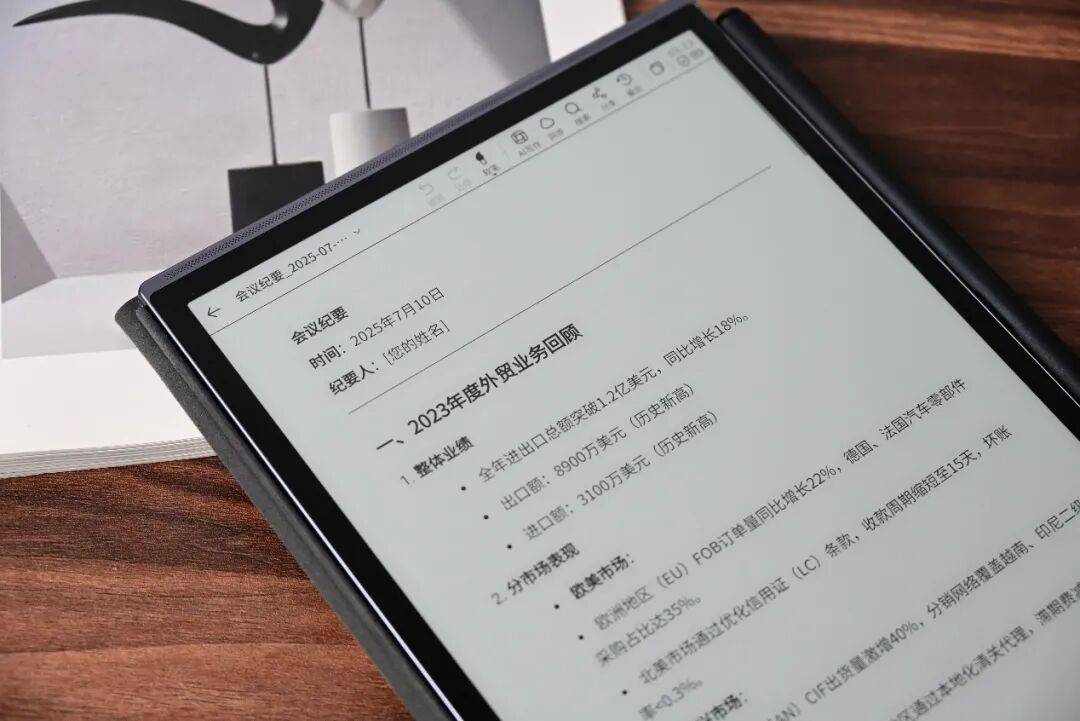 在外观设计上,曜石灰、水墨蓝、摩卡棕等五款配色方案满足不同商务场景需求,皮套与机身的质感统一彰显专业格调。设备预装讯飞书城、京东读书等平台,支持AI语音朗读功能,将办公场景延伸至碎片化阅读领域。开放的系统架构允许安装第三方应用,进一步拓展了设备的使用边界。