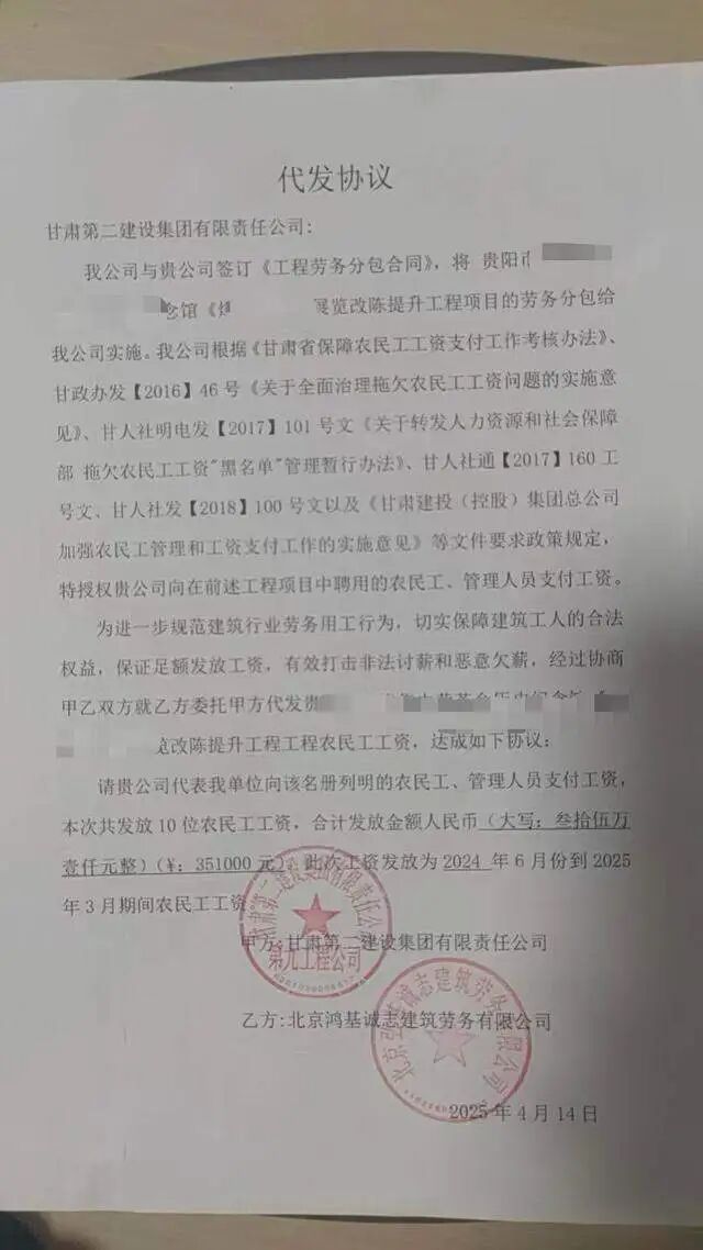 据那先生介绍,在他的多次催促下,北京鸿基与甘肃二建曾进行了协商,并在2025年初,两家公司达成协议:由甘肃二建直接代付那先生等10人的劳务费35.1万元。