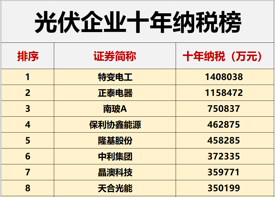 据黑鹰光伏不完全统计,从2010年-2019年,172家光伏上市公司(包括新三板)合计贡献了超过1200亿元,其中94家企业贡献税收超1亿元,30家企业超10亿元。其中,特变电工、正泰电器是仅有两家超100亿元的光伏企业,高居榜单第一、二位。
