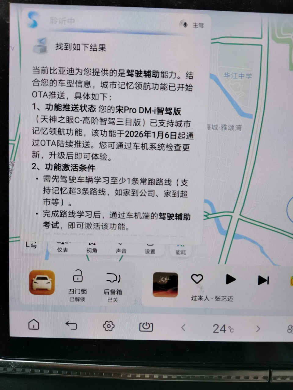 但是比亚迪并没有食言!在2025年年末的时候,网上就有小伙伴透露,进入2026年,比亚迪天神之眼C车型将推送城市记忆领航功能!但是没有想到,刚刚进入2026年,就有比亚迪车主已经收到了该功能的推送,有车主发图称,宋Pro DM-i智驾版车型已经支持城市记忆领航功能,该功能于1月6日起通过OTA陆续推送。