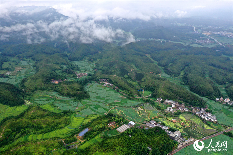 航拍镜头下,姚西村的千亩莲池宛如一幅生动的田园水墨画。人民网记者时雨摄