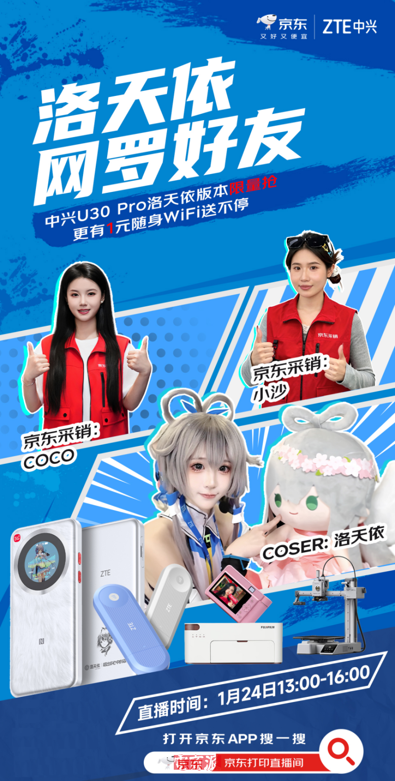 直播中,人气COSER洛天依与京东3C数码采销同台互动,不仅借助中兴U30 Pro洛天依限定版随身WiFi实时连线直播间,带领线上观众“云”逛展。现场还设置了免费照片打印区,参与互动即可获得漫展现场高清写真,吸引了众多二次元玩家。此外,直播间同步推出“抽免单及5折购机资格”等福利活动,进一步激发了网友的参与热情。