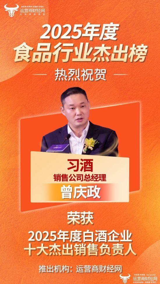 近日,由运营商财经网独家打造的“2025年度白酒企业十大杰出销售负责人”名单正式揭晓,习酒销售公司总经理曾庆政成功上榜!