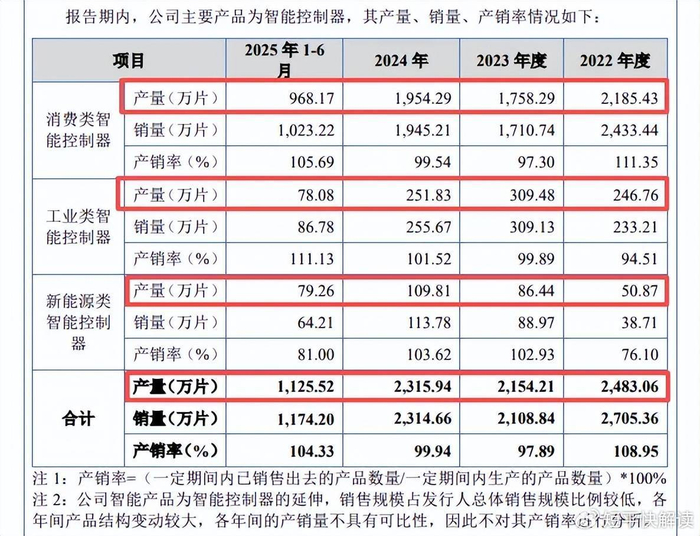 公司主要产品为智能控制器,报告期产量波动较大,分别为2,483.06万片、2,154.21万片、2,315.94万片、1,125.52万片,2024年较2022年峰值存在不小的差距。其中消费类智能控制器产量分别为2,185.43万片、1,758.29万片、1,954.29万片、968.17万片,工业类智能控制器产量分别为246.76万片、309.48万片、251.83万片、78.08万片,均呈现波动态势,不过新能源类智能控制器产量稳增,分别为50.87万片、86.44万片、109.81万片、79.26万片。