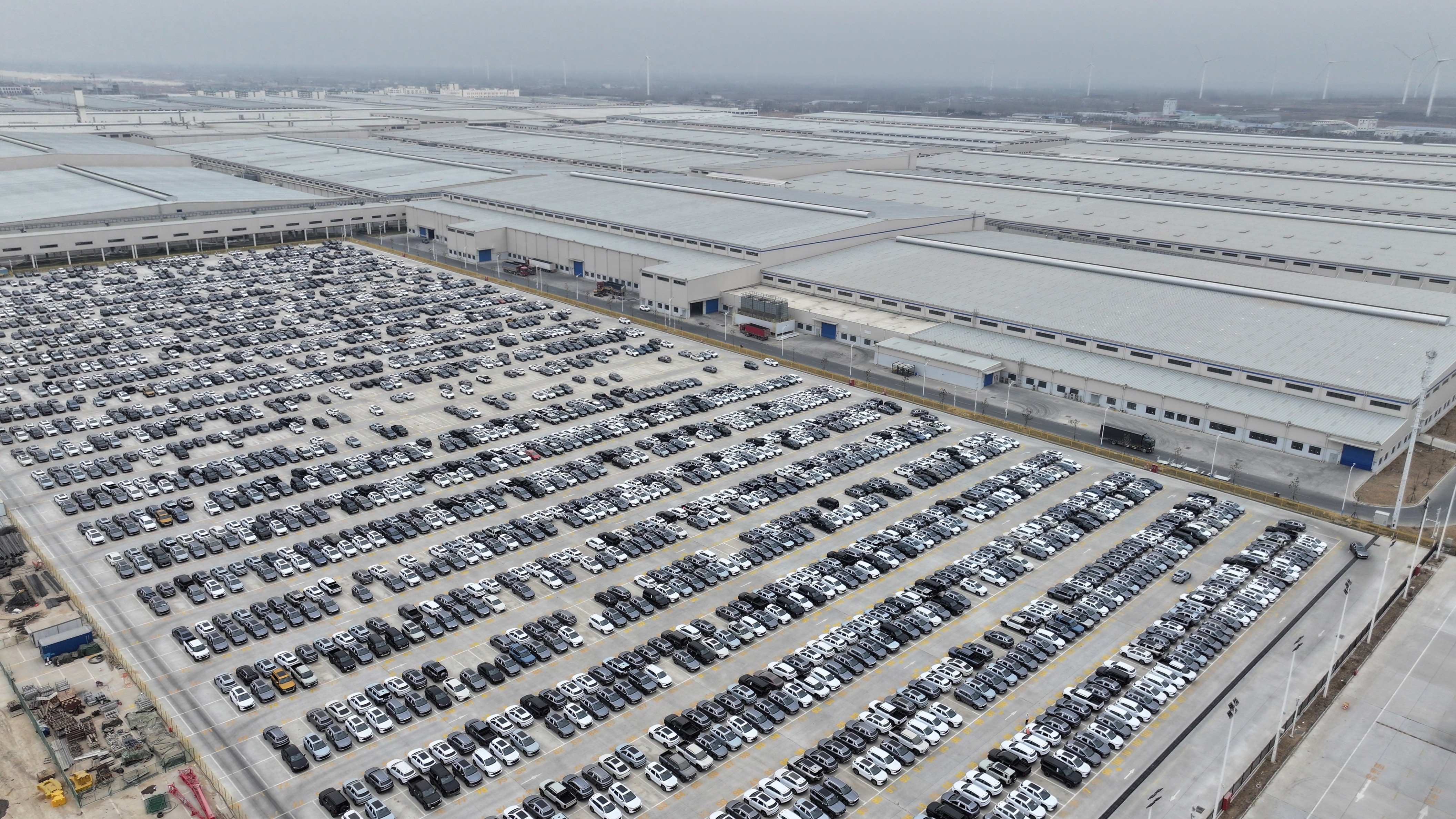 新下线的比亚迪整车在比亚迪厂区停车场整齐停放。图片来源:河南日报