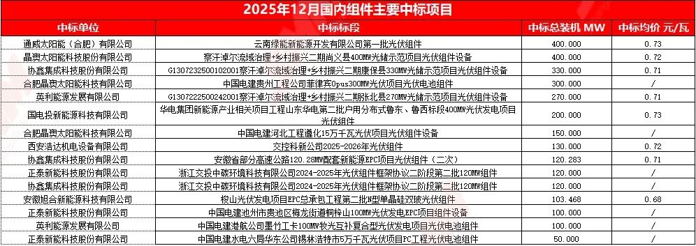 通威太阳能(合肥)有限公司,晶澳太阳能科技股份有限公司,协鑫集成科技股份有限公司,合肥晶澳太阳能科技有限公司,英利能源发展有限公司,国电投新能源科技有限公司,合肥晶澳太阳能科技有限公司,西安浩达机电设备有限公司,协鑫集成科技股份有限公司,正泰新能科技股份有限公司,协鑫集成科技股份有限公司,安徽旭合新能源科技有限公司,正泰新能科技股份有限公司,英利能源发展有限公司,正泰新能科技股份有限公司等共计94项,数据处理后,披露装机容量项目共94项,披露中标装机价格25项,当前统计区间采购定标组件型号主要为N型组件。