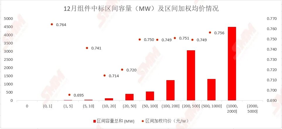 500MW-1000MW的标段共2个项目占11.62%,区间均价为0.749元/瓦;