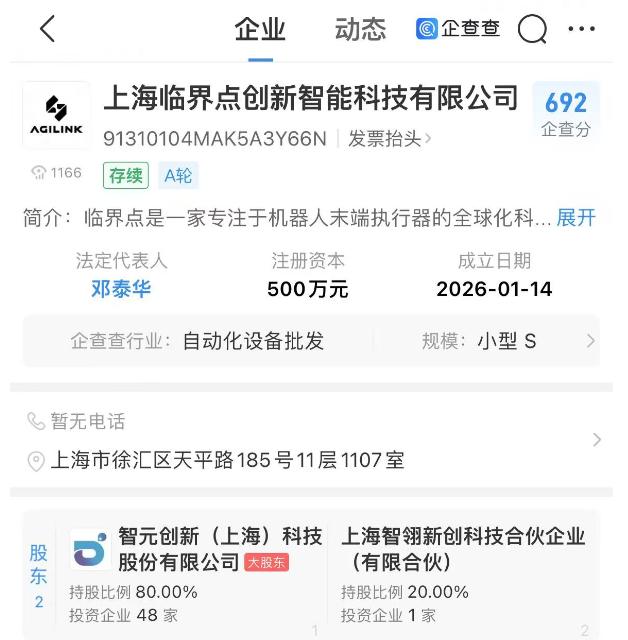 临界点是智元机器人对灵巧手业务的进行拆分独立后成立的新公司。智元机器人出资400万元,持有临界点80%的股权。