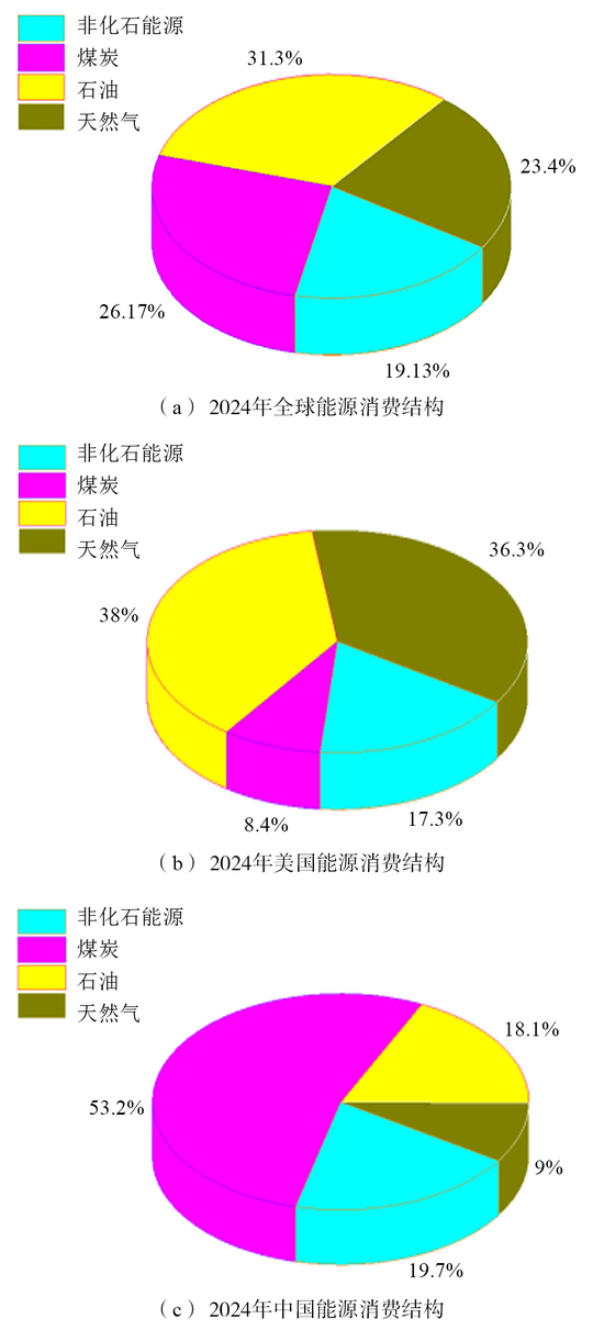 当前国际政治环境错综复杂,全球能源格局正处于深度调整期。乌克兰危机持续冲击欧洲地区和平稳定,中美关系中的不确定性因素持续累积,在此背景下,我国能源转型战略必须充分考虑国际环境的复杂性与不确定性。全球能源供需格局呈现多极化趋势,能源消费重心进一步向亚太新兴经济体集中(占全球消费总量47.1%),而油气供给中心则逐步西移,形成以中东(31.5%)、美国(20.1%)和俄罗斯(11.5%)为主的供应格局,其中美国油气产量近年来大幅增长,2023年石油产量达8.3亿t。此格局变化更加凸显实现能源体系自主安全可控的极端重要性。需要清醒认识到,不发展是最大的不安全,脱离国情盲目“去煤化”将背离保障经济社会稳定运行的主线,可能引发能源电力供应安全风险、资产搁浅、宏观经济冲击、金融风险乃至社会风险等一系列问题,必须高度警惕。立足我国“富煤贫油少气”的资源禀赋,必须坚定不移筑牢以煤为主的能源安全屏障,2024年全球及中、美能源消费结构如图1所示。