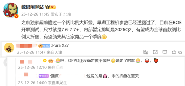 据CNMO了解,该博主曾透露过疑似华为Pura X2折叠屏的相关信息。据其介绍,一款阔比例大折叠手机目前正在京东方进行屏幕测试,其内屏尺寸预计在7.6至7.7英寸。从内部暂定的排期来看,新机将在2026年第二季度发布。此外,该博主称其可能领先其他竞争对手的同类产品约一个季度,有望成为全球首款阔比例大折叠手机。