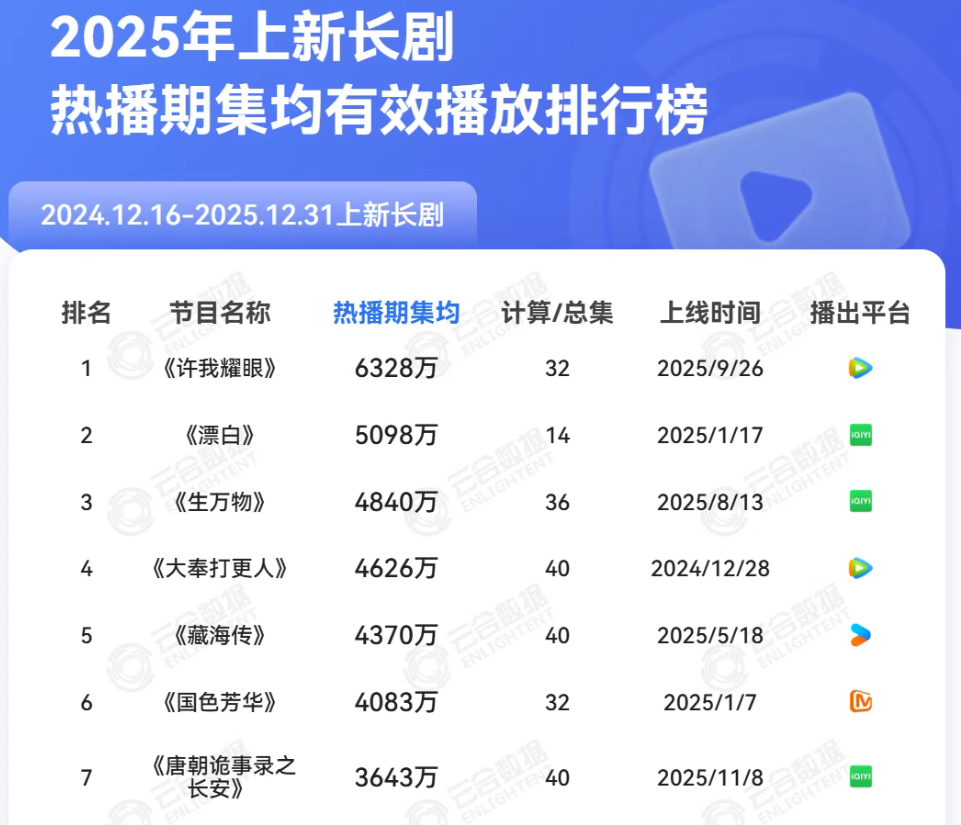 云合数据显示,2025年上新长剧霸屏榜TOP20的正片有效播放为296亿,同比去年缩减20%。其中头部剧里集均播放量最出色的,是赵露思、陈伟霆主演的《许我耀眼》,集均播放量6083万;而这样的成绩放在往年,甚至难以进入前五。(2023年集均播放量最高的《狂飙》为1.4亿,2024年的《庆余年2》为9000万。)