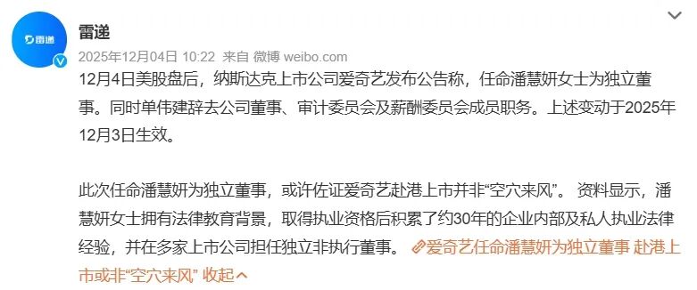 虽然没有正面回应,但爱奇艺最近半年以来的人事调整,一直与奔赴港交所有着千丝万缕的联系。赴港上市传闻出现不久,百度的CFO何海建空降爱奇艺出任董事长的职位;2025年12月,爱奇艺又宣布任命法律专家潘慧妍为独立董事。何海建此前曾担任金山云CFO,成功操盘金山云在美股与港股的双重上市,拥有丰富的投行及并购经验;潘慧妍取得执业资格后积累了约30年的企业内部及私人执业法律经验,并在多家上市公司担任独立非执行董事。