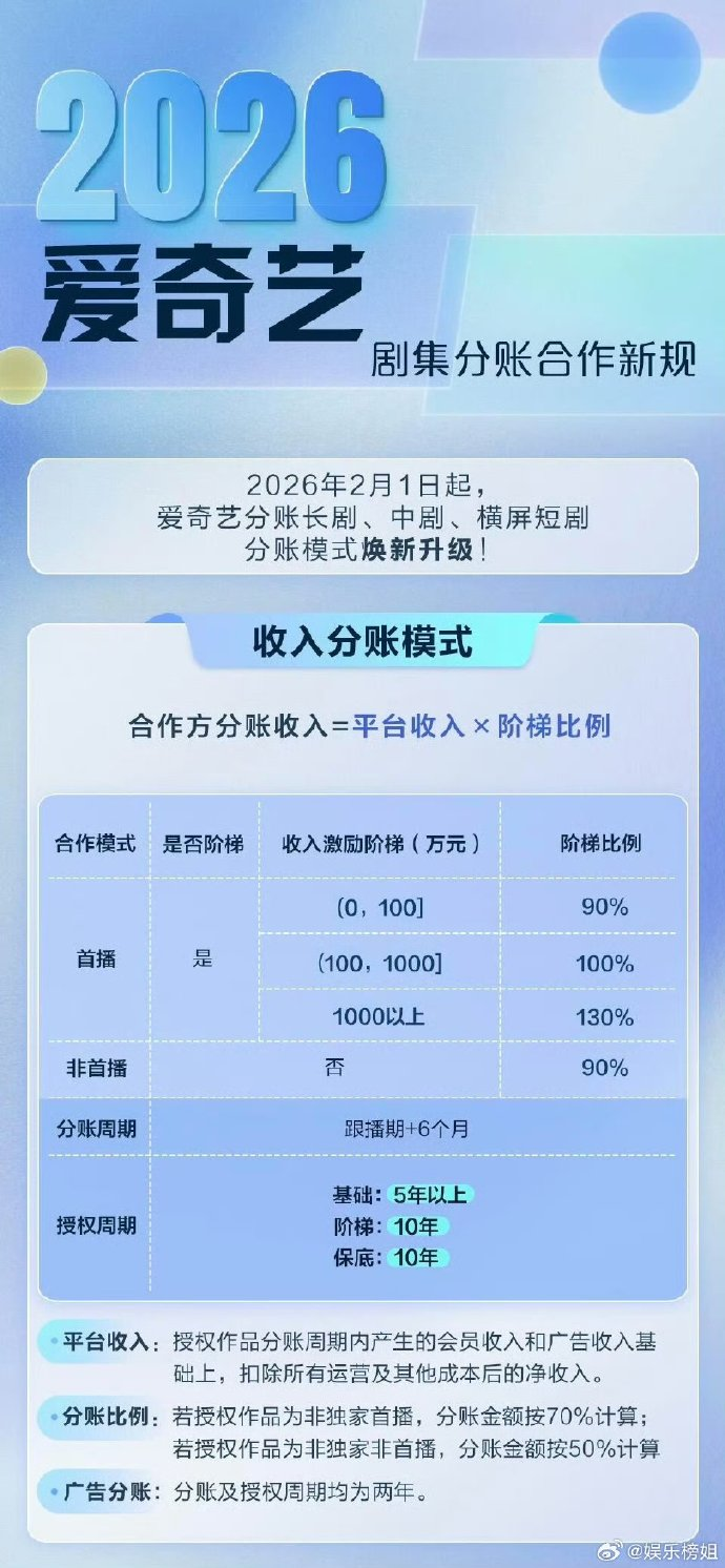 就在宣布汪骏离职的同一天,爱奇艺官宣更新剧集分账模式,引发了业内关注。从最新规则来看,爱奇艺剧集以前的“按播放量分账”将全面转向“收入分账”,也就是以平台实际营收为核算依据,平台与制作方共享收益、共担风险。
