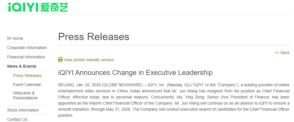 近日,爱奇艺(IQ.US)宣布首席财务官(CFO)汪骏因个人原因辞去职务,委任财务高级副总裁曾颖为临时CFO,公司将物色新的首席财务官正式人选。