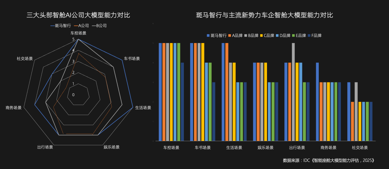 斑马智行智能座舱AI大模型能力处于行业第一阵营。国际调研机构IDC针对中国主流的3家智舱AI公司及6家头部新能源车企进行多维评测,斑马智行在7大场景中以3项满分、总分第一成绩领先。