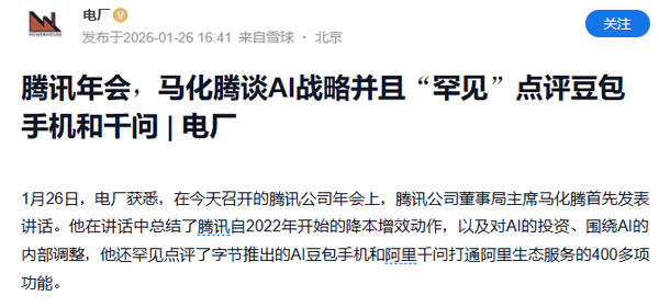 【CNMO科技消息】1月26日,在腾讯公司年度大会上,腾讯公司董事局主席马化腾就AI发展趋势发表讲话,并罕见公开评价近期引发广泛关注的“豆包手机”。他未直接否定产品创新,而是从技术路径与用户安全角度提出审慎观察。