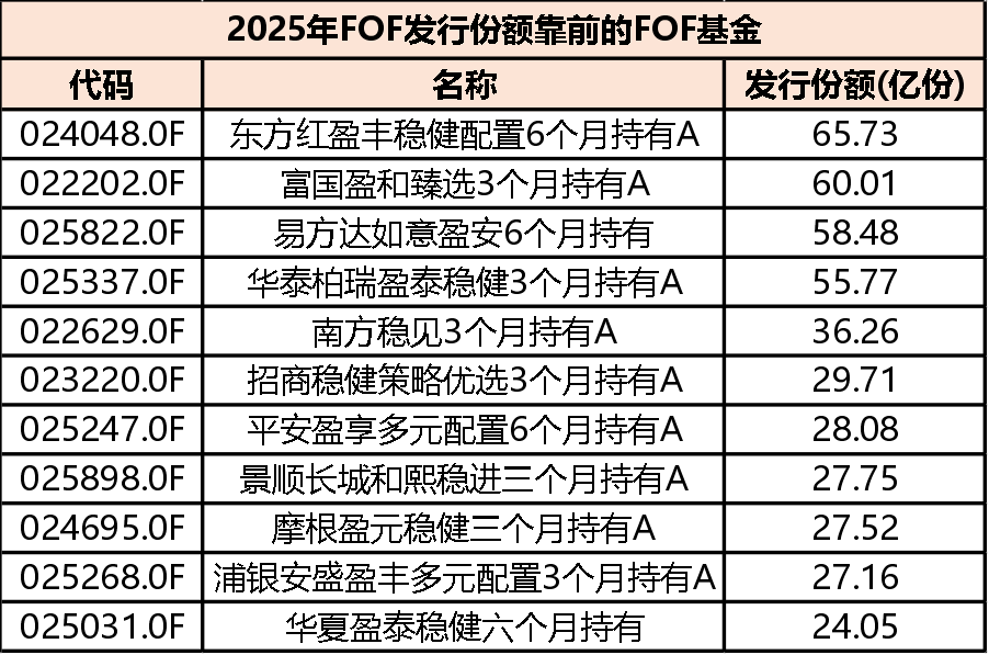 市场回暖并未掩盖结构性问题。FOF行业分化加剧,规模超百亿的产品仅1只,只有成立未满1年的富国盈和甄选3个月持有(022202.OF),中欧盈选稳健6个月持有(017587.OF)和国泰瑞悦3个月持有(016644.OF)逼近百亿,50亿以上仅9只,多数是2025年刚成立的产品。