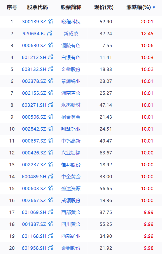 截至收盘,铜陵有色(000630.SZ)、白银有色(601212.SH)、金徽股份(603132.SH)、章源钨业(002378.SZ)、湖南黄金(002155.SZ)、永杰新材(603271.SH)、招金黄金(000506.SZ)、翔鹭钨业(002842.SZ)、中钨高新(000657.SZ)、兴业银锡(000426.SZ)等20多只个股纷纷涨停。
