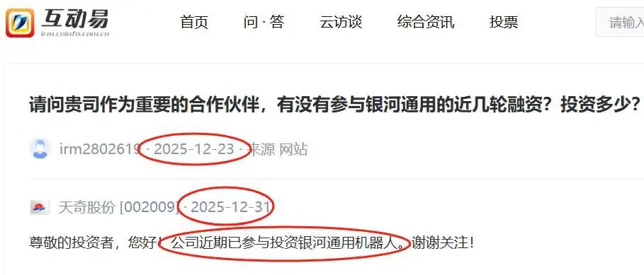 “银河通用机器人”公众号早在12月19日就官宣了融资消息。然后有投资者可能获取了该消息,于12月23日在互动平台向天奇股份提问,但一直未获得回复,直至12月31日。