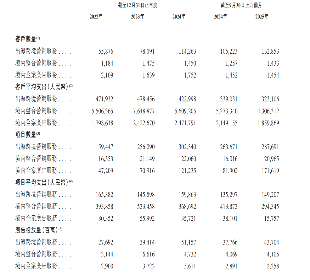 具体看,公司出海业务客户数两年内翻倍,2022年约为5.6万,2024年则约11.4万。然而,单客平均年支出却从47.2万元降至42.3万元,两年下滑超10%。2025年前九个月进一步降至约32.3万元,呈现量增价跌的趋势。