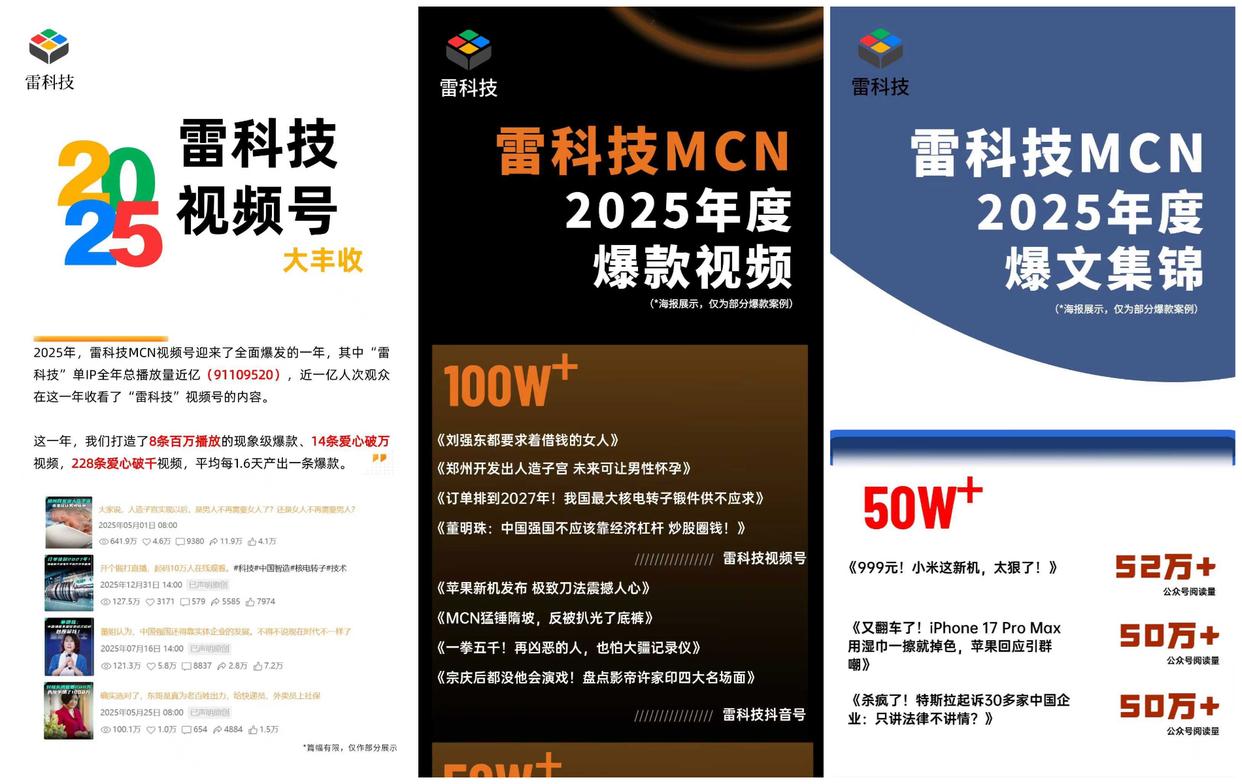 某种程度上,这次改版也可以被看作雷科技专注 AI 硬科技的顺势而为。过去一年,雷科技 MCN 体系全年共产出 111 条爆款视频,其中 100 万播放量以上内容超过 8 条,50 万播放量以上超过 14 条;雷科技视频号累计发布 1190 多条内容,全年播放量接近 8.8 亿,单年涨粉超过 100 万;公众号体系全年产出 82 篇 10 万+爆文,3 篇公众号阅读量超过了 50 万。
