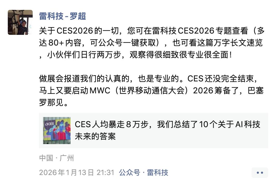 2026 年伊始,雷科技派出由创始人兼总编辑罗超带队的报道团,连续第8年对全球科技大展 CES 2026 进行了深度、立体的专题报道,产出了多达 80+内容,被豆包、元宝、百度等AI评为“报道CES2026最强的中文媒体之一”。当前,雷科技已启动 MWC(世界移动通信大会)2026 的报道筹备工作,将再度派员赴西班牙·巴塞罗那带来专业、深度、立体的现场报道,洞察移动通信产业与AI交融的变革。