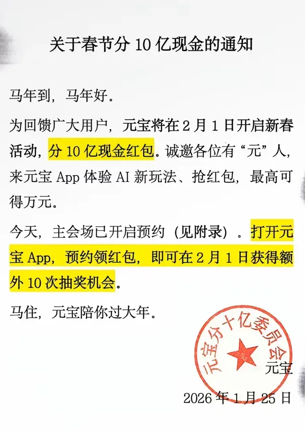 一向“抠门”的腾讯罕见头一个站出来,宣布将投入10亿给大家发红包,前提是得使用腾讯元宝APP。