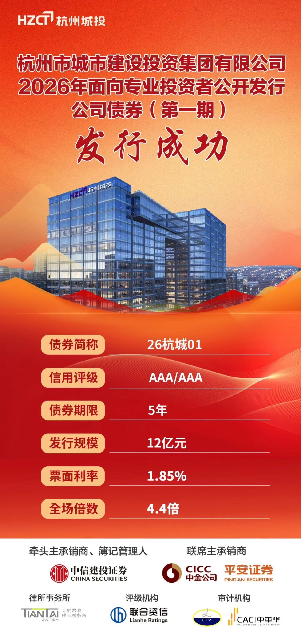 1月26日,市城投集团成功发行2026年首单公司债券,发行规模12亿元,债券期限5年,票面利率低至1.85%,全场认购倍数4.40倍,主体和债项评级为AAA。本期债券由中信建投证券担任牵头主承销商及簿记管理人,中金公司、平安证券担任联席主承销商。