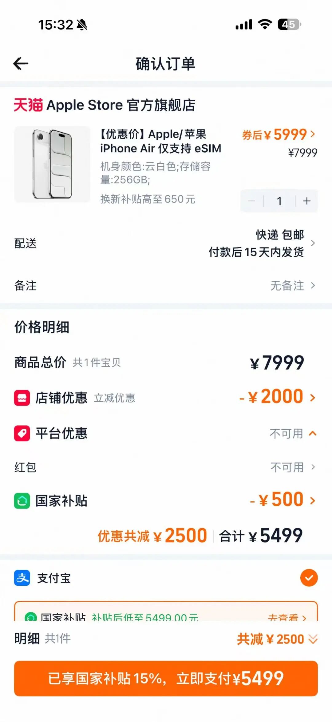 其中,上线仅3个月余的iPhone Air,原价7999元起,年货节满减2000元后,达到国补条件,可再减500元,累计降价2500元,如今5499元便可拿下;iPhone 17系列也降价300元。