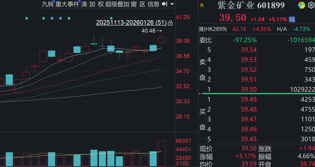 1月26日,A股市场资源与能源股大涨,紫金矿业(601899)、中国海油(600938)盘中双双创出股价新高,总市值均突破万亿元,跻身“万亿市值俱乐部”。与此同时,白银有色、湖南黄金、兴业银锡等多只有色金属股涨停。