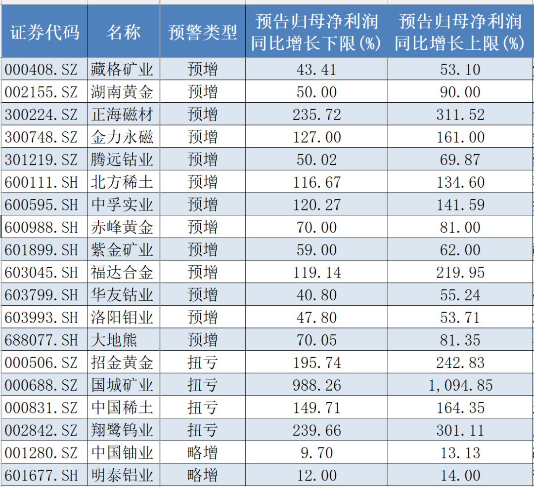 稀土永磁板块,中国稀土、北方稀土、正海磁材、金力永磁等公司预计的2025年净利润同比增幅下限均超过100%。