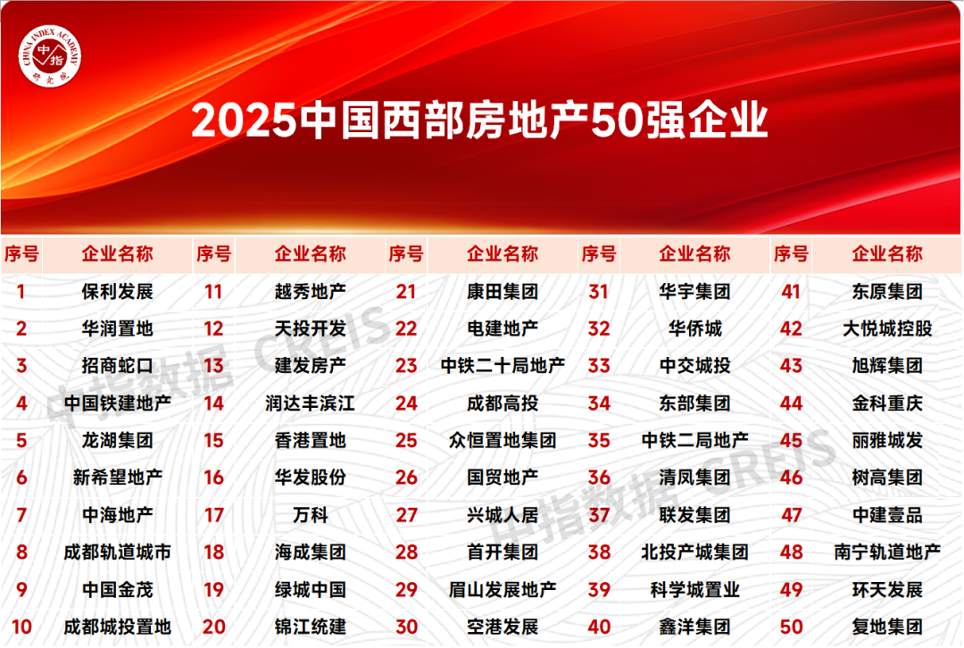 2025年,西部市场集中度持续攀升。成都销售额TOP30企业市场份额达67.8%,前十占比近40%;重庆中心城区TOP20企业市场份额高达77.1%,前十占比超50%。