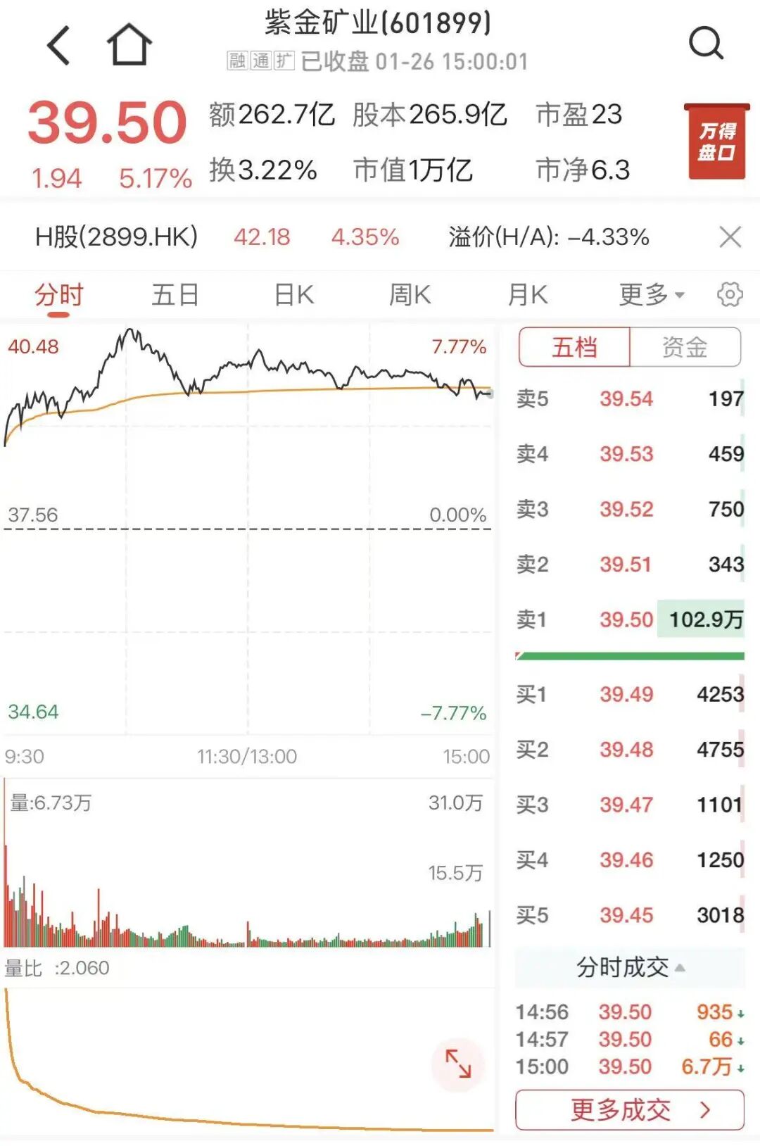 数据显示,截至1月26日收盘,紫金矿业股价报39.5元/股,收盘涨幅为5.17%,总市值为1万亿元。