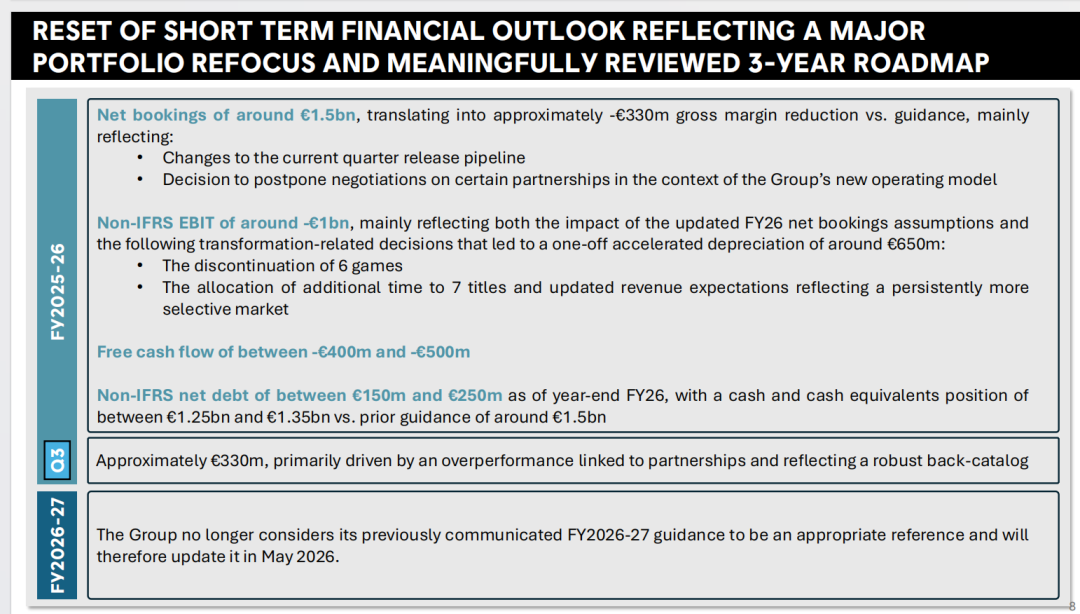 在1月21日发布的文件中,哪怕管理层宣称对公司2026年和2027年的发展前景非常乐观,但文件中也提到2025-2026财年育碧仍预计会出现负4亿欧元到负5亿欧元的自由现金流缺口。因此从这个角度来看,育碧大胆推进重大组织架构重组,更是毫不留情面地加速成本削减计划,就是为了给自己开辟出唯一的活路。