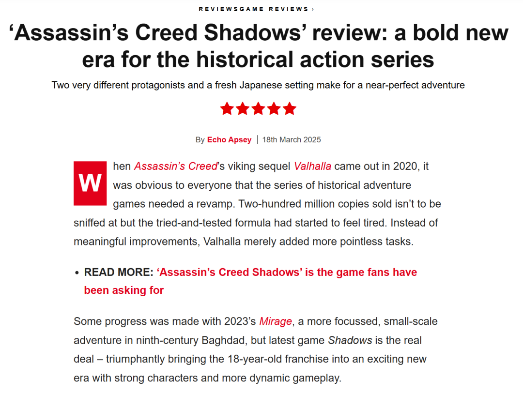 所以我们今年能够看到,在反复强调了三年的「品类聚焦」之后,育碧还是跑出了一些成果。你可能注意到刚才我形容《刺客信条:影》是“口碑两极分化”,原因是因为虽然政治正确的确让人心生不愉,但也有不少玩家认为游戏画面美、世界观大、玩法也有许多可取之处。甚至不少海外媒体更是夸得肉麻,将其称为“系列的新起点”。
