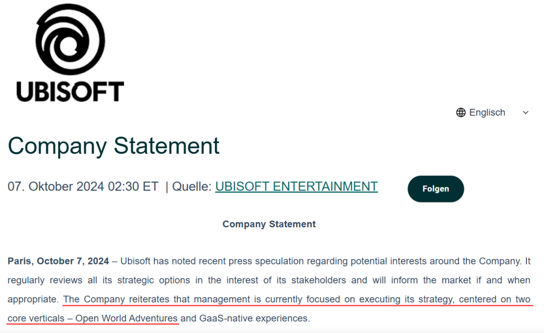 其实早在2024年,当时育碧在回应腾讯收购传闻的声明中就曾提到,称育碧管理层目前专注于执行其战略,以两个核心垂直领域为中心,即开放世界冒险和GaaS原生体验。