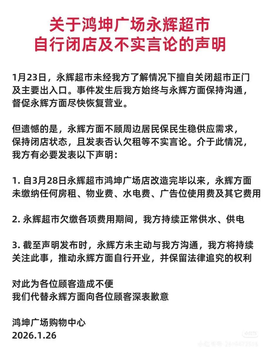 针对超市方面的这份通知,1月26日,鸿坤广场购物中心在社交平台发布了一份《关于鸿坤广场永辉超市自行闭店及不实言论的声明》,进行公开回应。