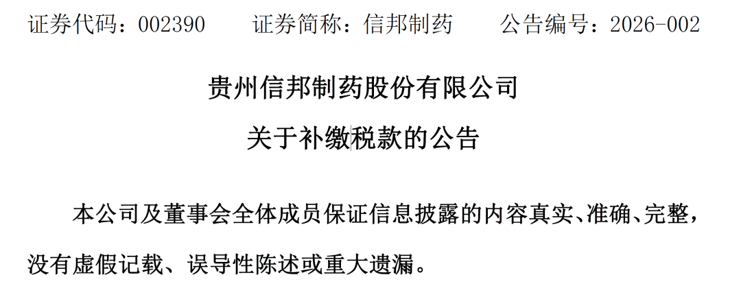 今日(1 月 26 日),贵州信邦制药股份有限公司发布《关于补缴税款的公告》,披露信邦制药及下属子公司根据前期主管税务机关要求对相关涉税事项开展了自查,公司及下属子公司需补缴税款及滞纳金 5,078.69 万元,其中:信邦制药 269.57 万元,下属子公司 4,809.12 万元。